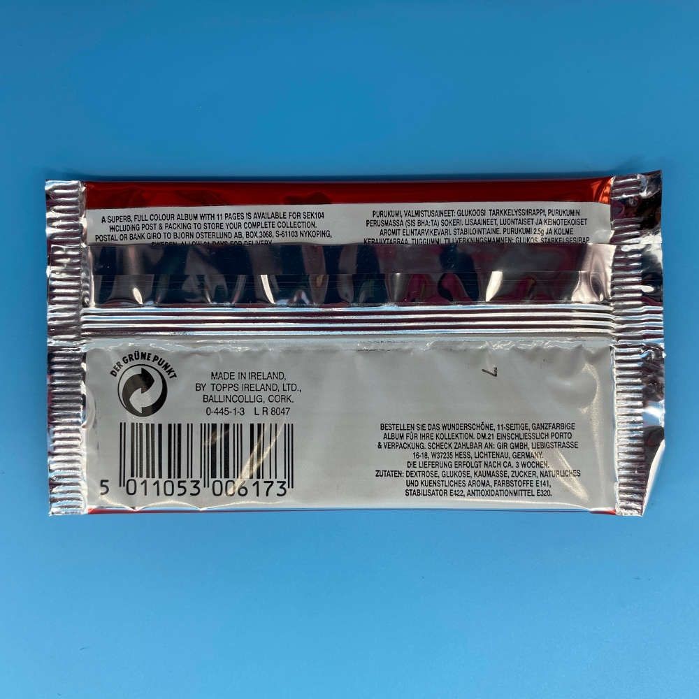 - Format: Single trading card packet with gum