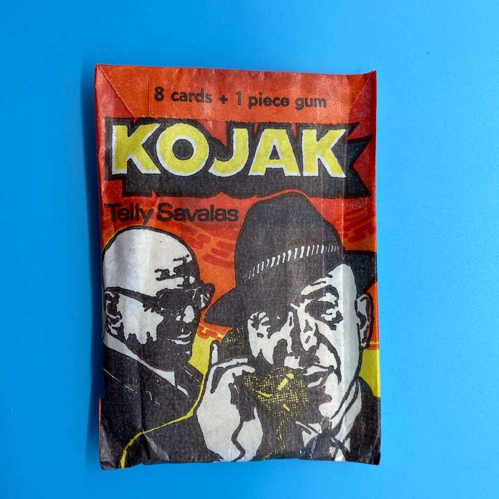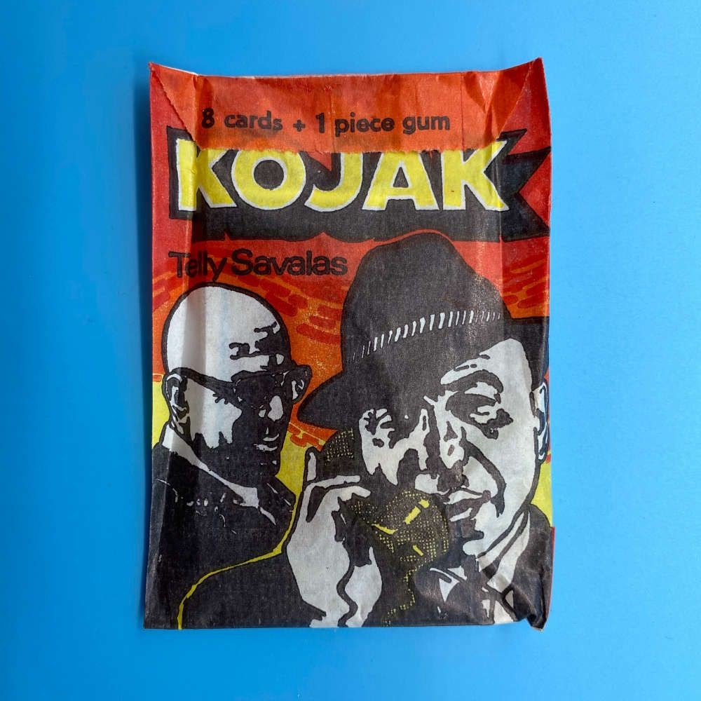 Kojak trading card packet by Monty Gum (1975), featuring Telly Savalas. Contains 8 cards and 1 stick of gum. Based on the Universal TV crime drama series.