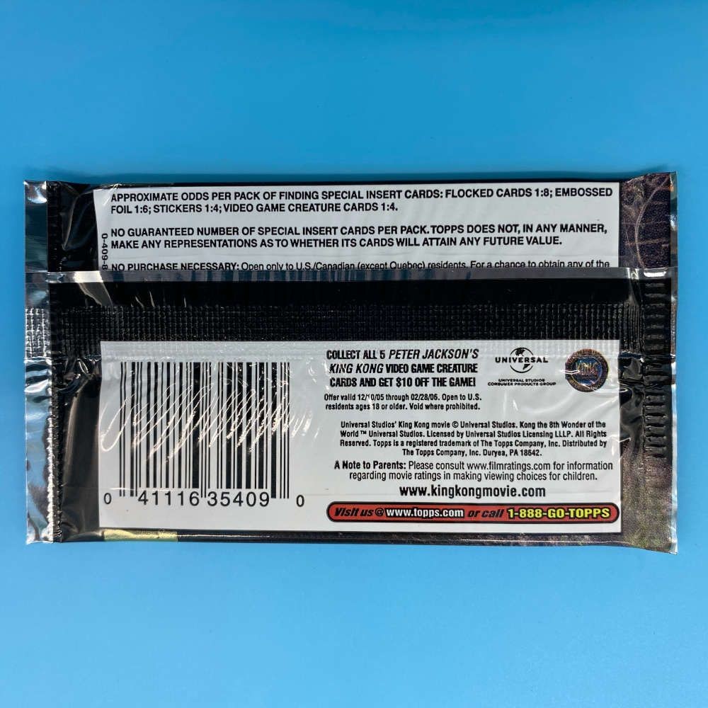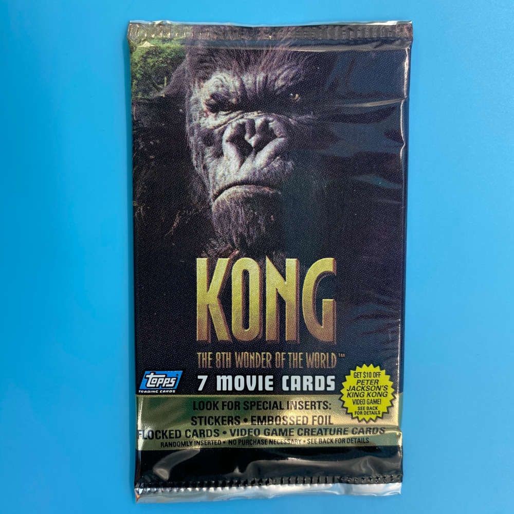Kong The 8th Wonder of the World trading card packet by Topps (2005). Includes 7 cards. Look for stickers, foil, flocked, and video game creature cards.