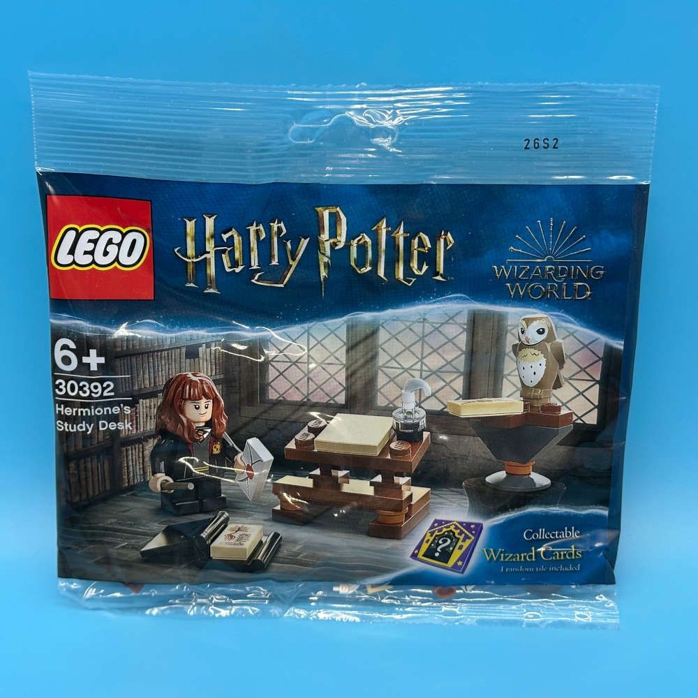 LEGO Harry Potter 30392 Hermione’s Study Desk set from 2021. Includes Hermione minifigure, study desk build, and 1 randomly inserted Wizard Card tile.