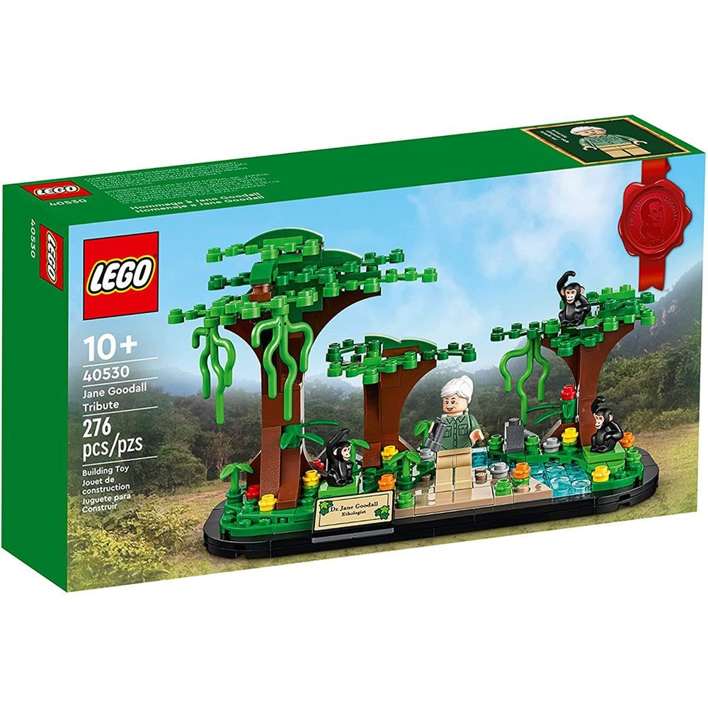LEGO Jane Goodall Tribute set 40530 honours the pioneering conservationist. Includes 276 pieces. Originally released as a promotional item in 2022.