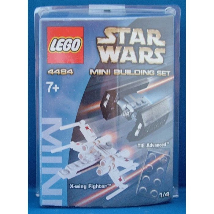 LEGO Mini Building Set 4484 from 2003. Includes micro builds of X-Wing Fighter and TIE Advanced. Part of Star Wars Mini series in clamshell display box.