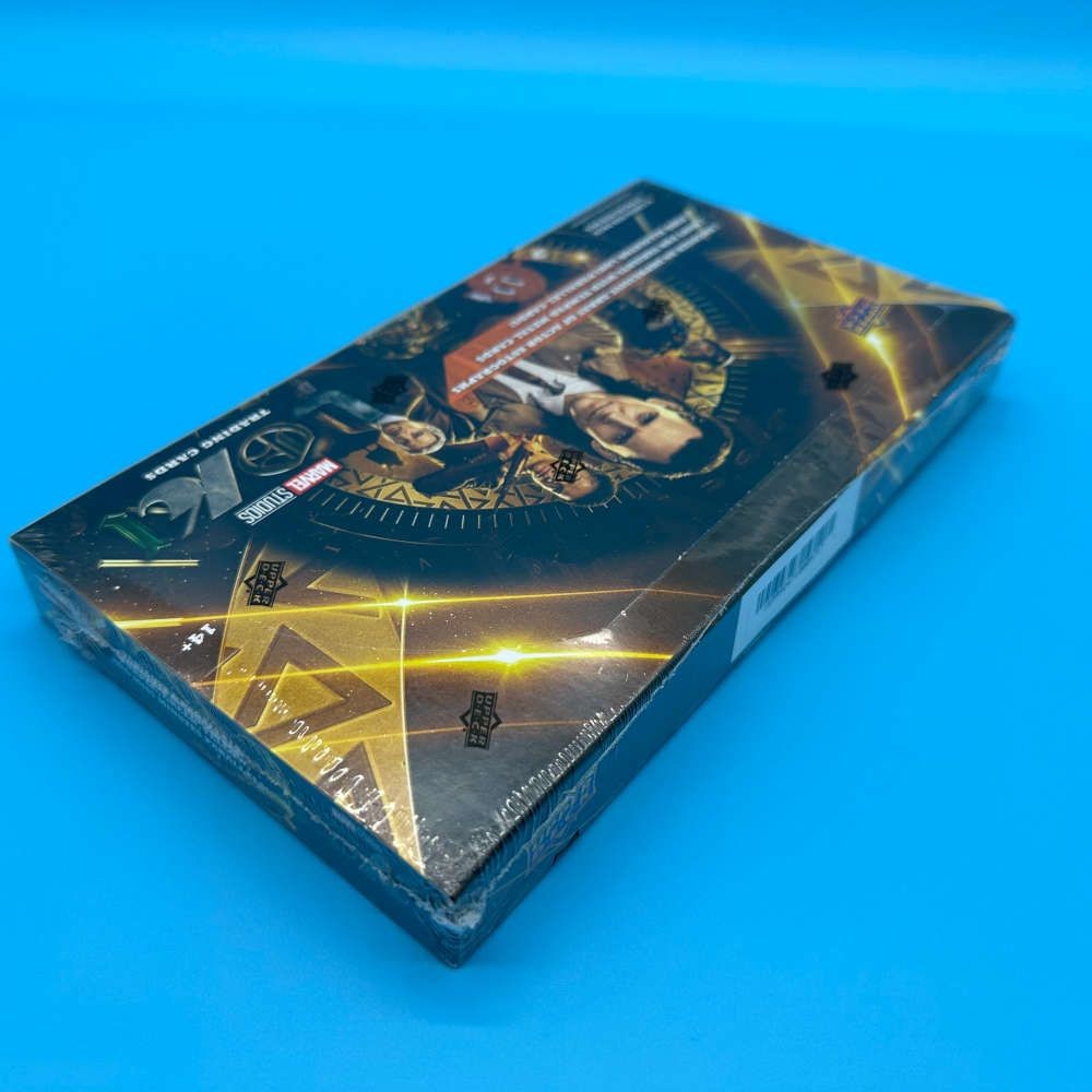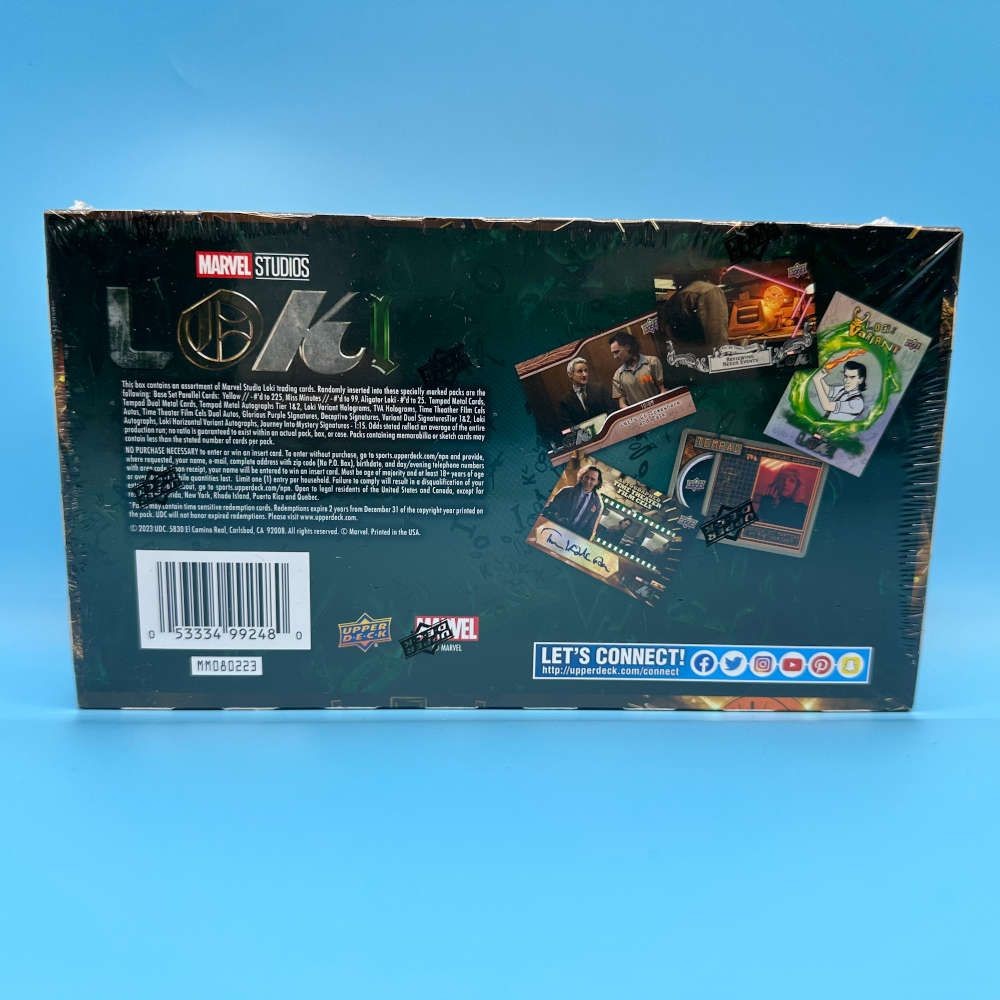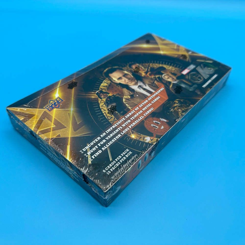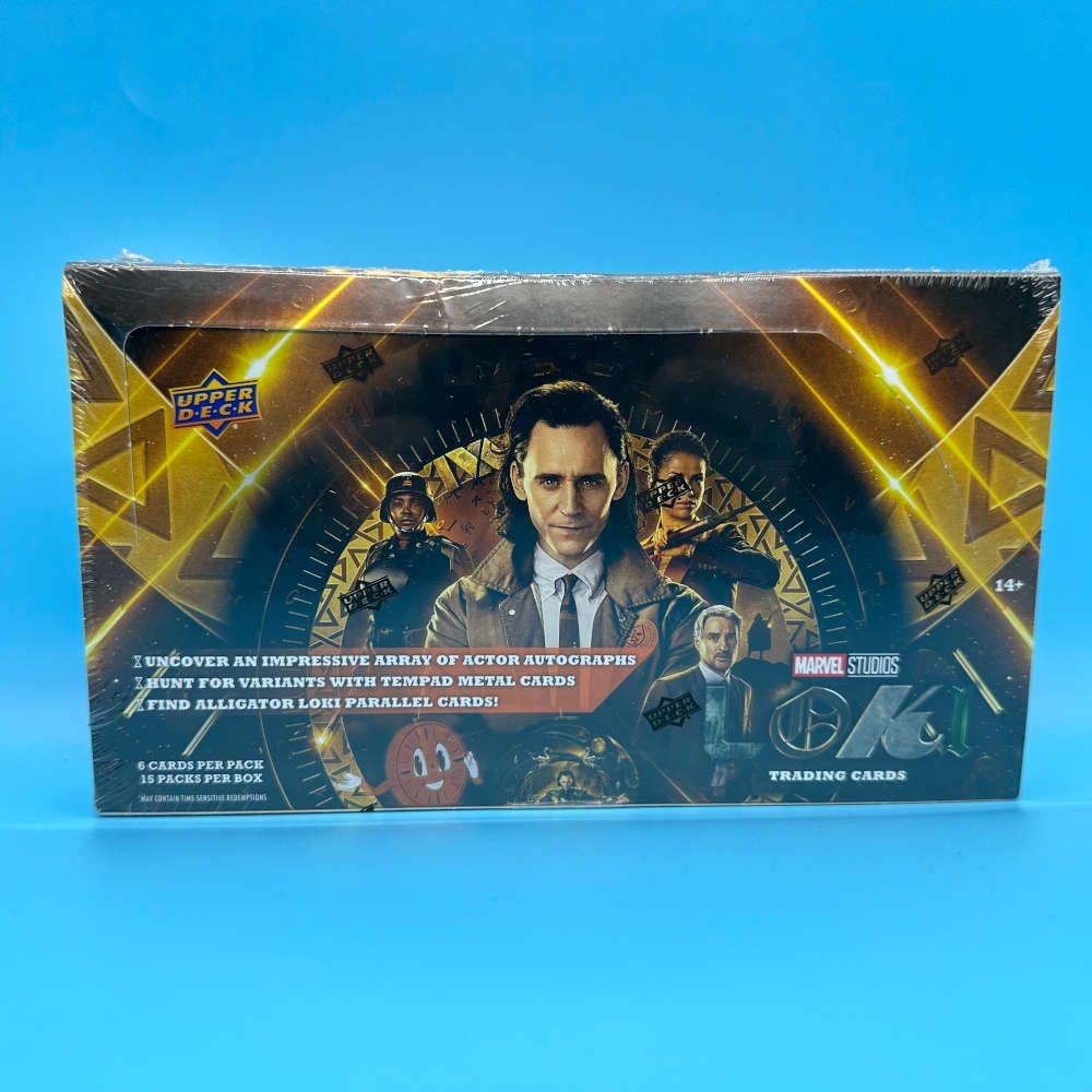 Loki trading card box by Upper Deck (2023). Includes 15 packets with 6 cards per pack. Look for actor autographs, Tempad metal variants, and Alligator Loki parallels.