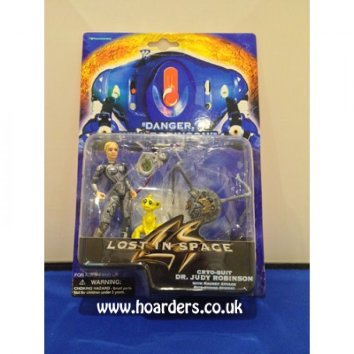 This officially licensed Lost in Space action figure features Dr. Judy Robinson in her cryo-suit, complete with Magnet Attack Bite-Strike Spider accessory. Produced by Trendmasters in 1997, this figure is part of the Lost in Space collector’s line.