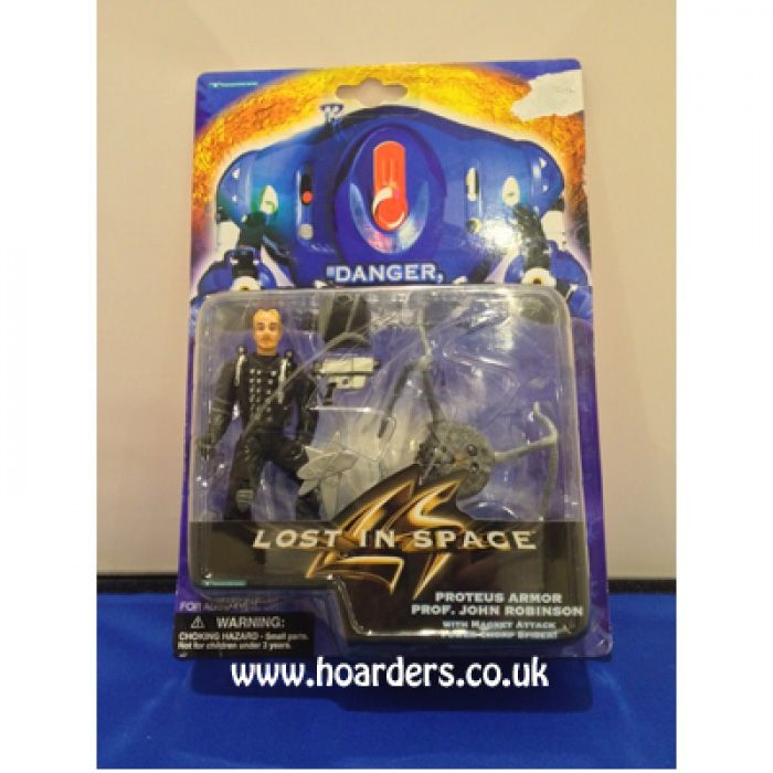 Lost in Space Proteus Armour Prof. John Robinson action figure by Trendmasters. Includes Magnet Attack Power-Chomp Spider. Factory sealed with minor box flaw. Released in 1997.