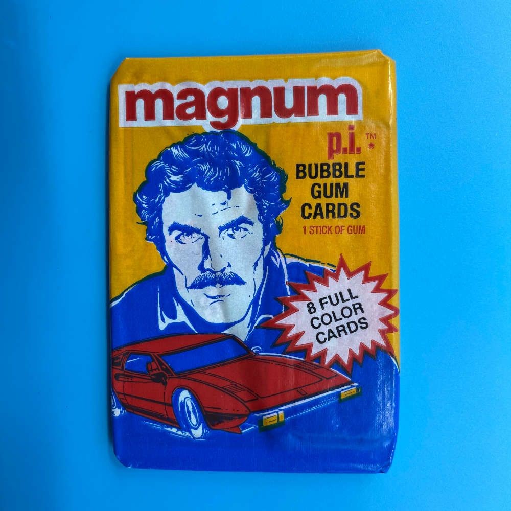 Magnum P.I. trading card packet by Donruss (1983), featuring 8 cards and 1 stick of gum. Based on the classic TV series starring Tom Selleck as Thomas Magnum.