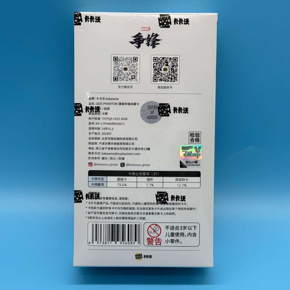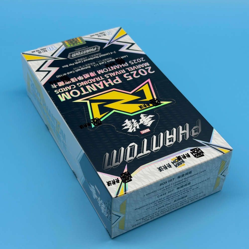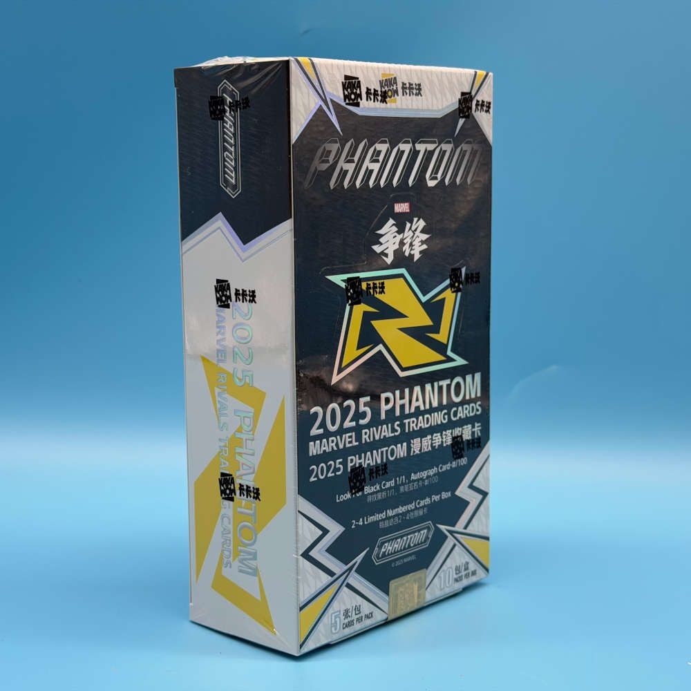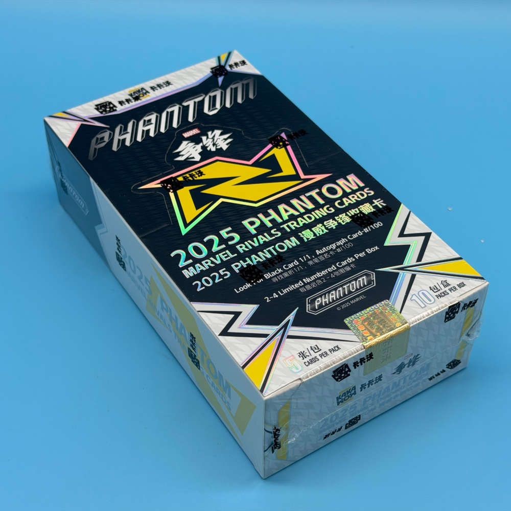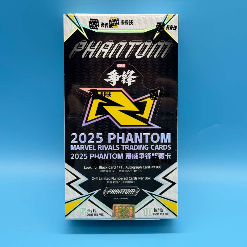 Marvel Rivals 2025 Phantom trading cards box by KakaWow, officially licensed by Marvel and Disney. Each factory-sealed box includes 10 packs containing 5 cards per pack. Collectors can find numbered inserts, autograph cards, and limited-edition Black 1/1 cards. Every box contains 2–4 limited-numbered cards.