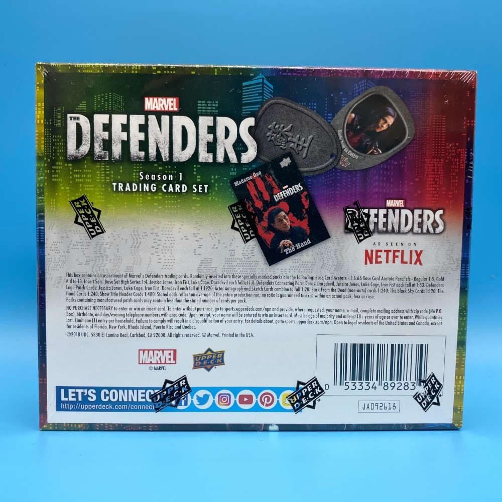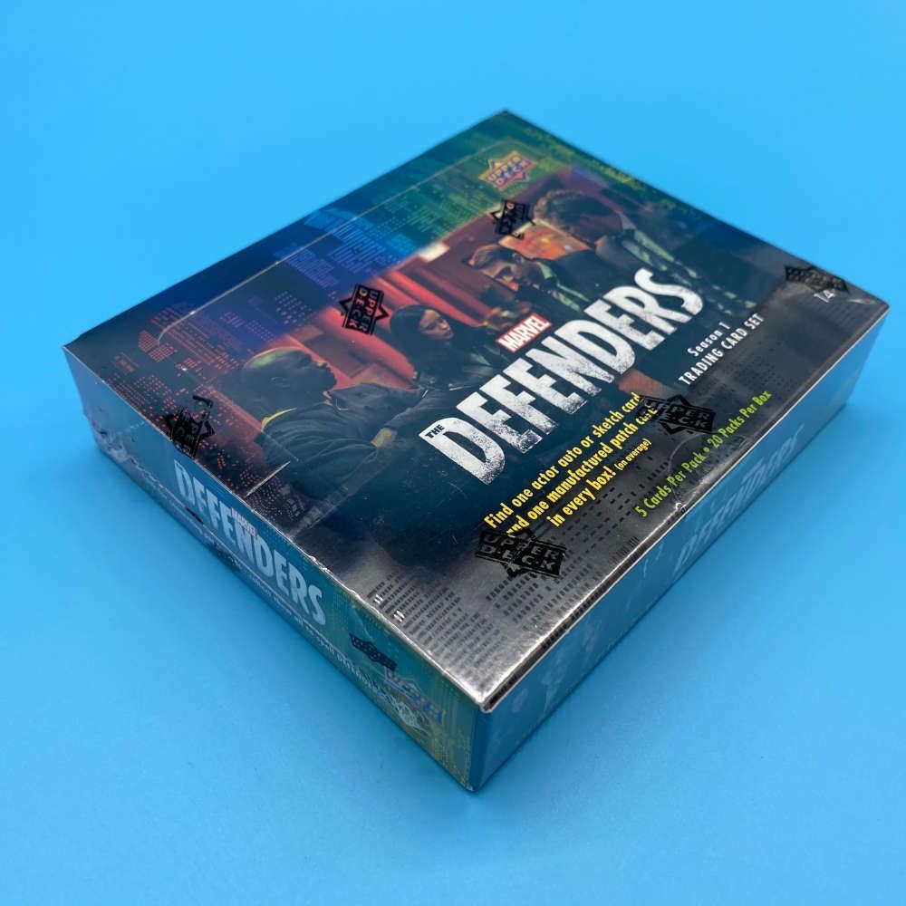 Factory trading card box from Marvel The Defenders Season 1 by Upper Deck. Each box includes 20 packets, with 5 cards per pack. Features characters from the Marvel Netflix series including Daredevil, Jessica Jones, Luke Cage, and Iron Fist. Box averages one actor autograph or sketch card and one manufactured patch card. Randomly inserted chase cards include Base Card Acetate Parallels, Gold inserts, Defender Connecting Patch cards, Defender Hand cards, Show Title Header cards, Back from the Dead cards, and The Black Sky cards.