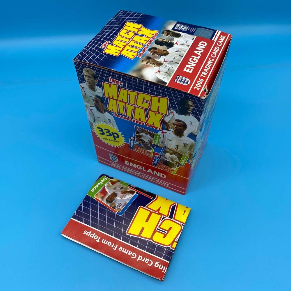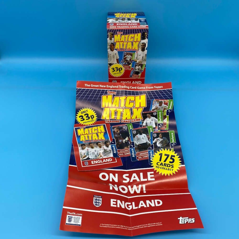 Match Attax England 2006 empty retail display box by Topps, originally used for the England national team edition of the trading card game. Includes original promotional poster insert.