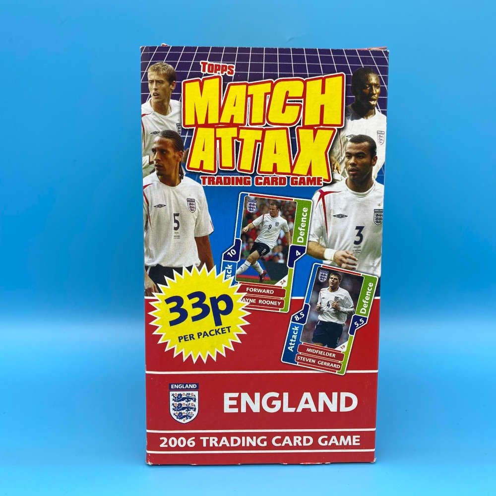 This display box was part of the England-themed 2006 Match Attax release, featuring key national team players such as Wayne Rooney, Steven Gerrard, and Rio Ferdinand. Designed for retail distribution with 33p per packet printed on the front. The box is empty but retains the original promotional poster panel inside.