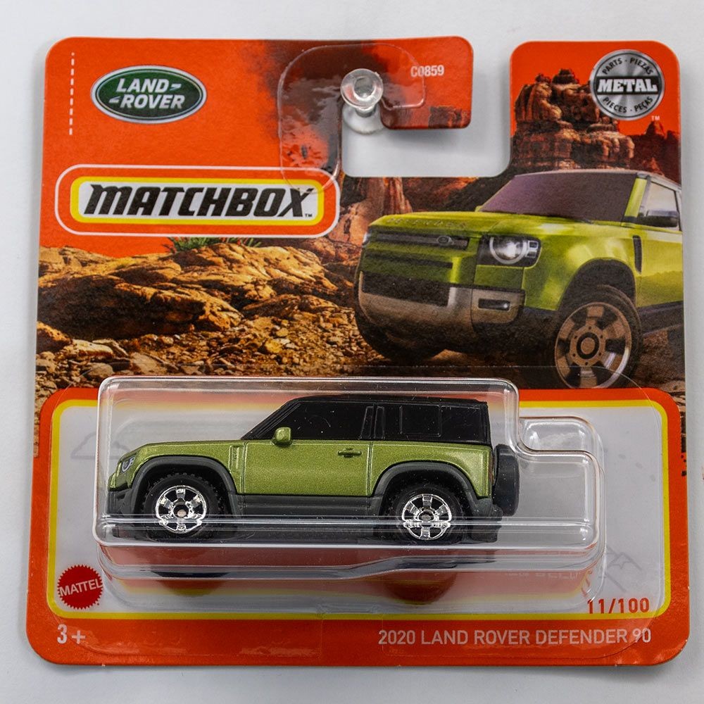 This Matchbox Land Rover Defender 90 was released in 2020 as part of the MBX Adventure City series. Numbered 11/100 in the mainline set, this die-cast features a metallic green finish with black roof and silver-spoked wheels. The model replicates the iconic off-road SUV with accurate proportions and rugged design cues. Packaged on an orange cardback with Land Rover branding.
