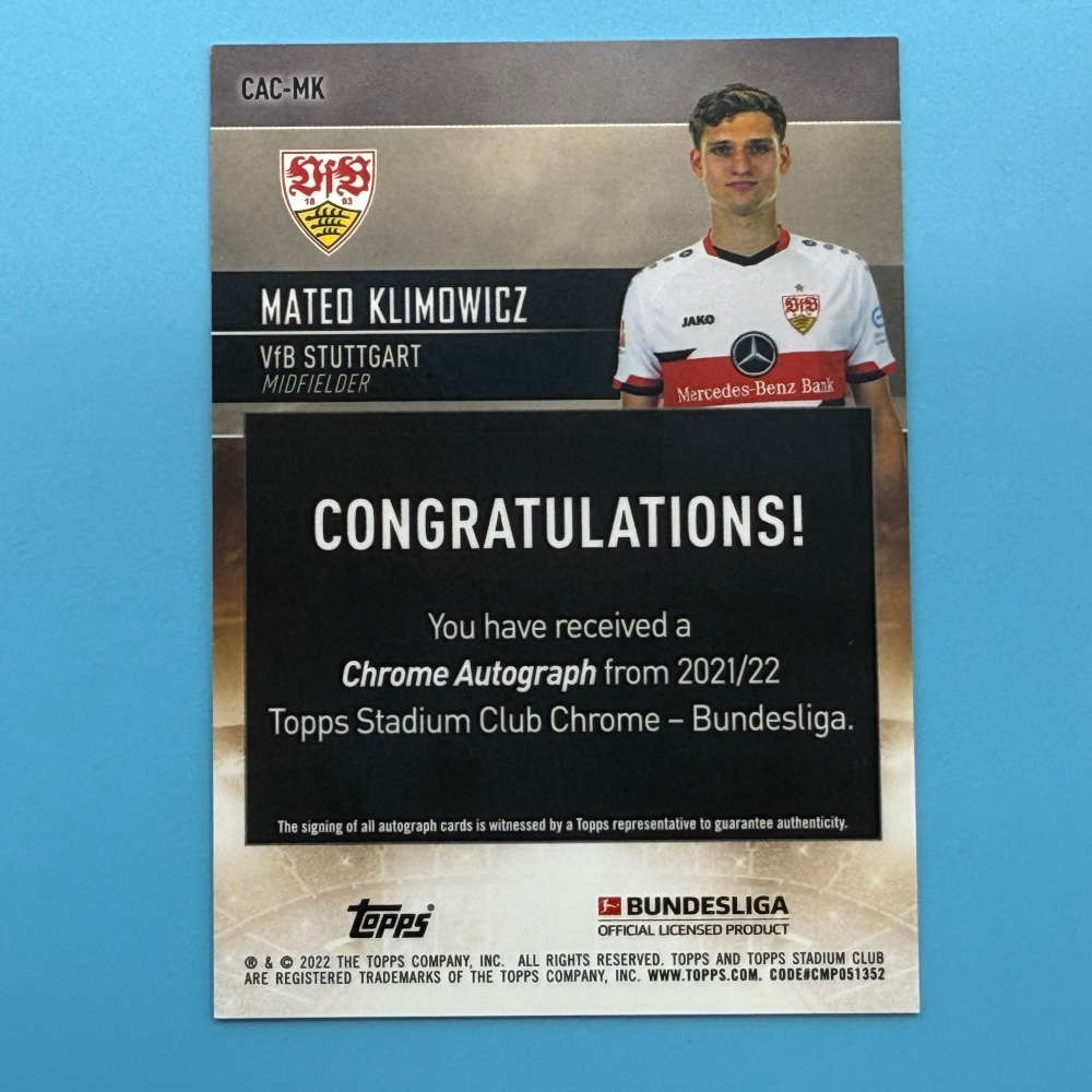 Official autograph card of Mateo Klimowicz for VfB Stuttgart from the 2021/22 Topps Stadium Club Chrome – Bundesliga set. This certified autograph card (code CAC-MK) features a chrome finish and is part of Topps' premium Bundesliga line. The signature was witnessed by a Topps representative to ensure authenticity. A sought-after card for Bundesliga collectors.