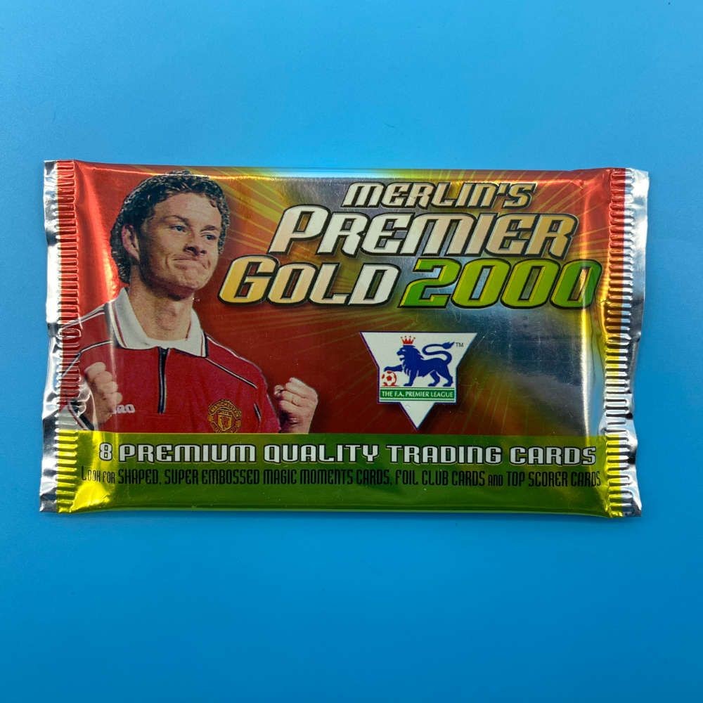 Merlin Premier Gold 2000 trading card packet by Merlin (1999). Includes 8 cards per pack. Look for randomly inserted Magic Moments, Foil Club, and Top Scorer cards.