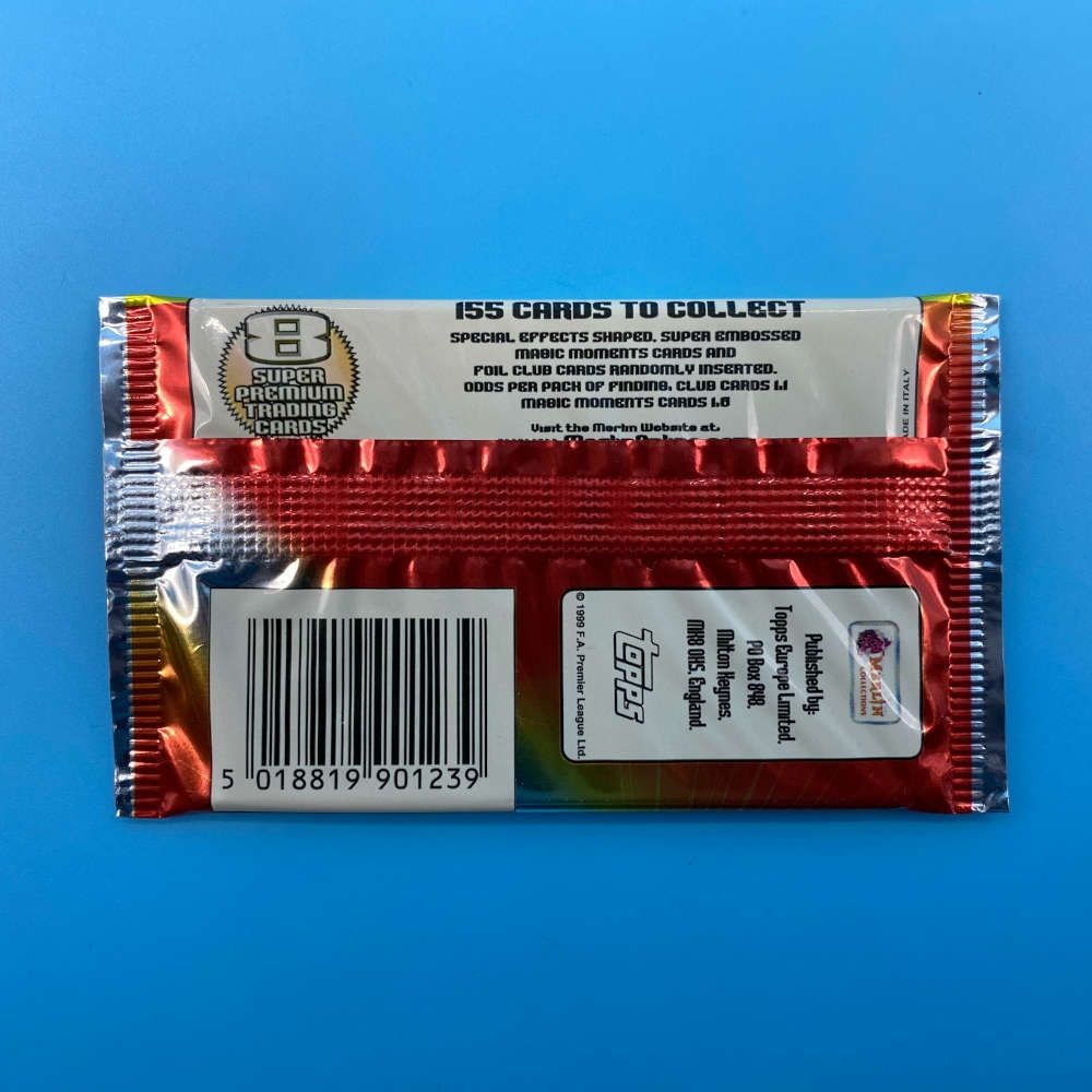 This officially licensed Premier League trading card packet was released by Merlin in 1999 for the Premier Gold 2000 series. Each pack contains 8 premium-quality cards, with a chance of finding shaped, super embossed Magic Moments cards, Foil Club Cards, and Top Scorer Cards. The set features footballers from the 1999–2000 Premier League season, packaged in a glossy foil wrapper showcasing star players of the era.