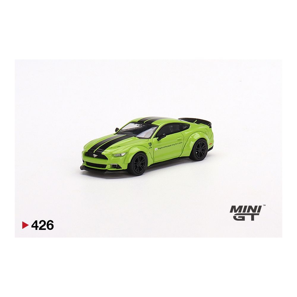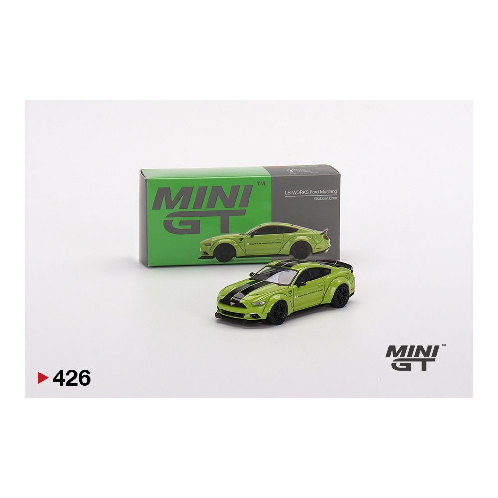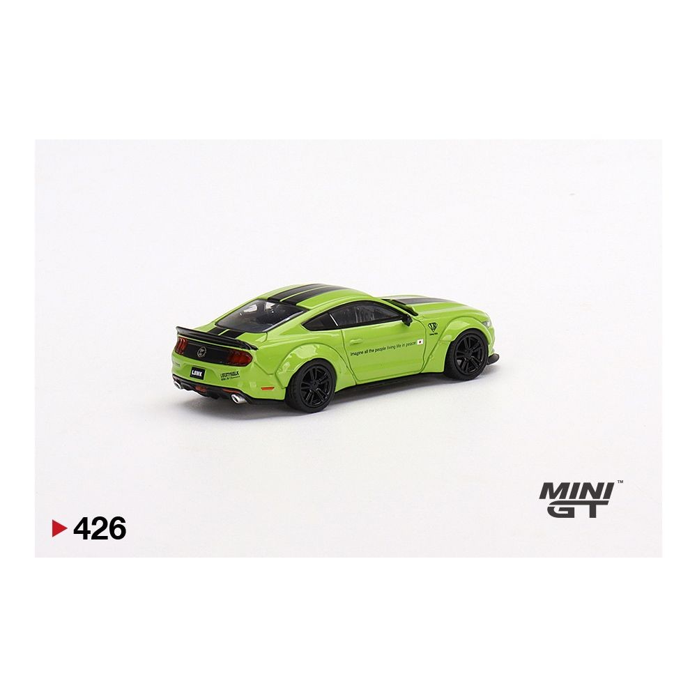 Mini GT 1:64 LB★WORKS Ford Mustang in Grabber Lime by Liberty Walk. This right-hand drive version features aggressive wide-body styling, black dual racing stripes, and detailed wheels and trim. Packaged in collector box format and officially licensed by Liberty Walk. Model number 426 from the Mini GT line by TSM Model, released in 2023.
