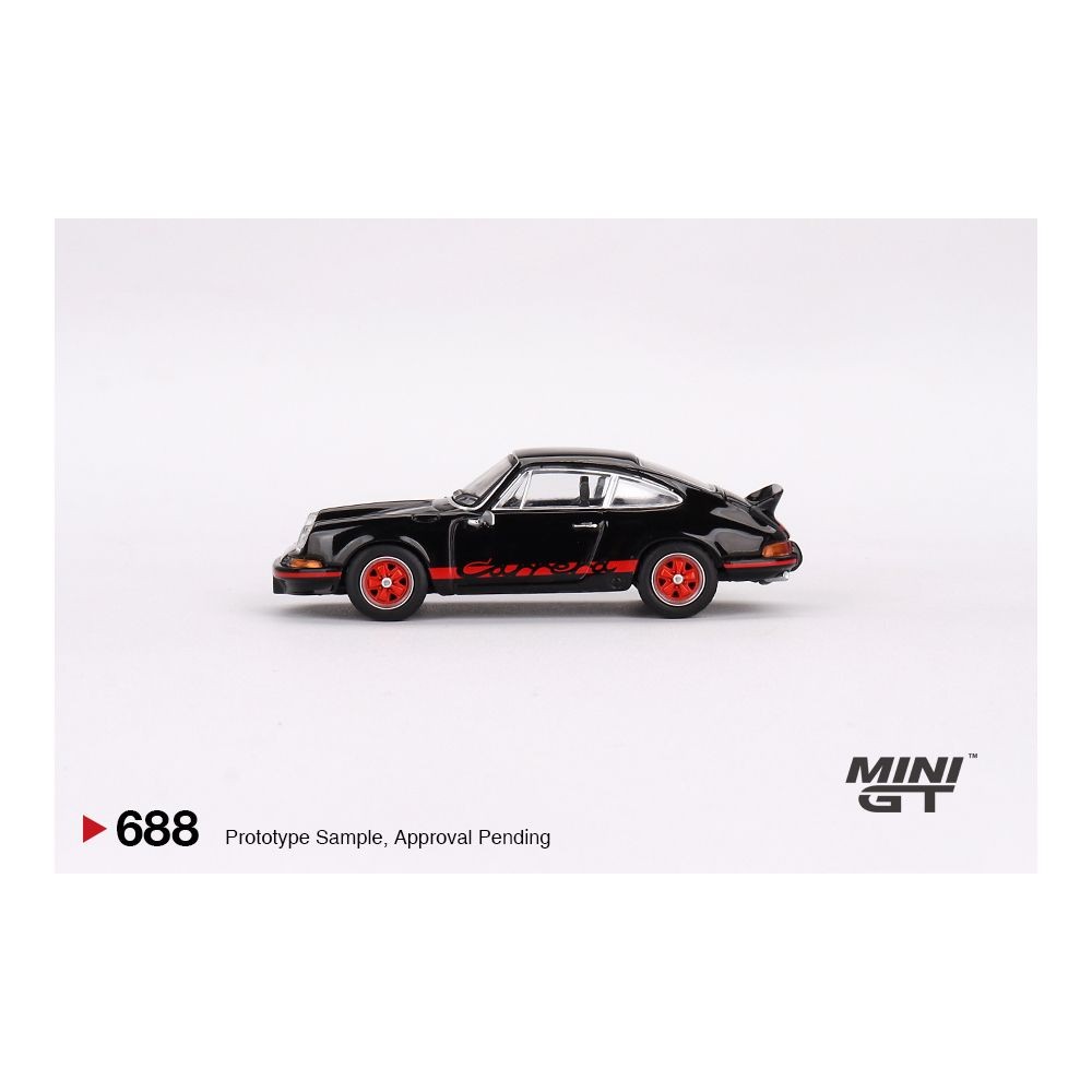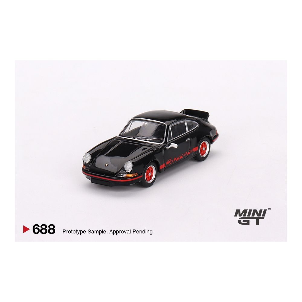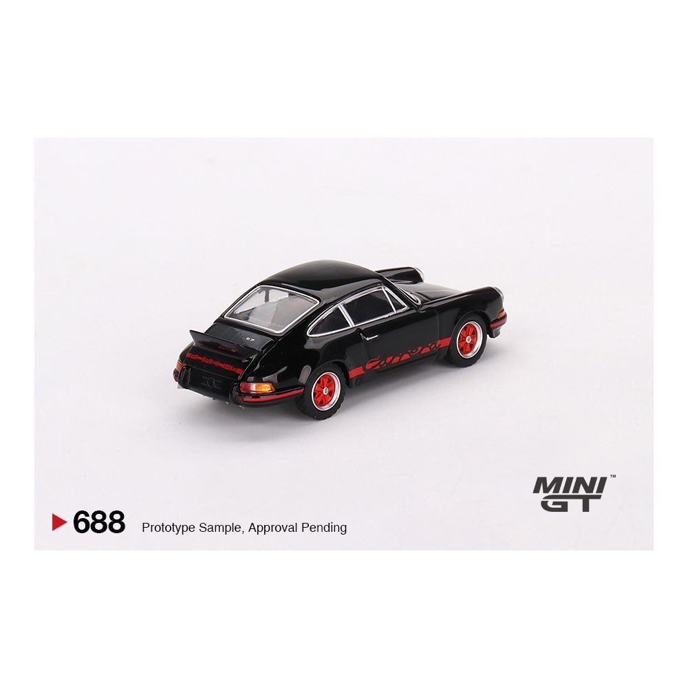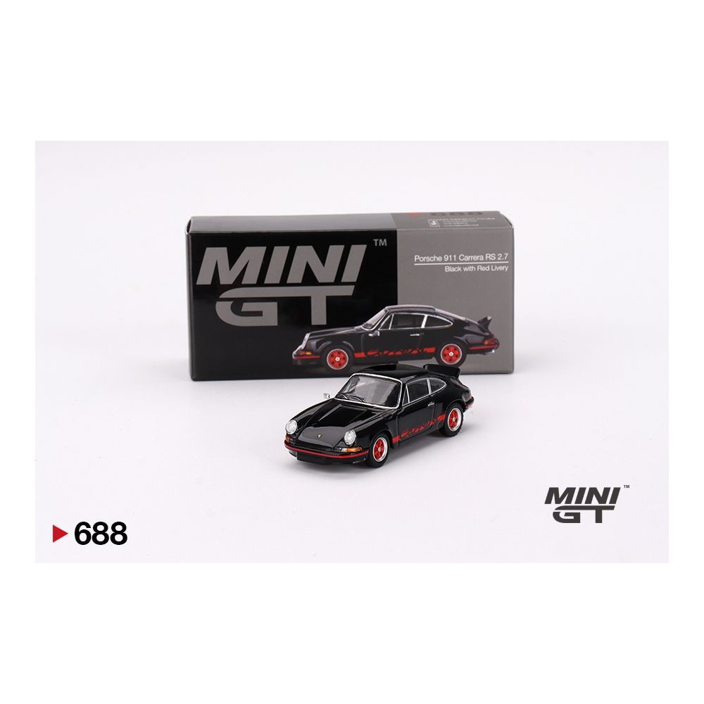 Mini GT Porsche 911 Carrera RS 2.7 in black with red livery. 1/64 scale die-cast with classic detailing and collector packaging. Model number MGT00688.