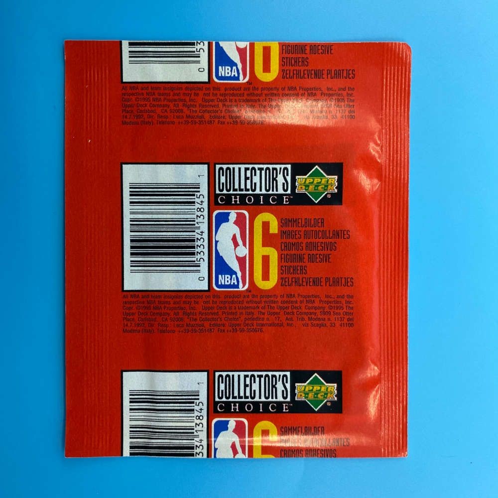 NBA Basketball 1995–96 Collector’s Choice single sticker packet by Upper Deck. Contains 6 stickers featuring players and teams from the 1995–96 NBA season.