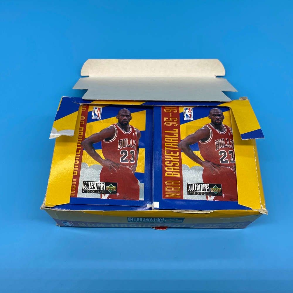 NBA Basketball 1995–96 Collector’s Choice sticker box by Upper Deck. Includes 100 packets, each containing 6 stickers. Features NBA stars from the 1995–96 season, with Michael Jordan on the box front. A colourful, officially licensed release showcasing player stickers across all major teams.