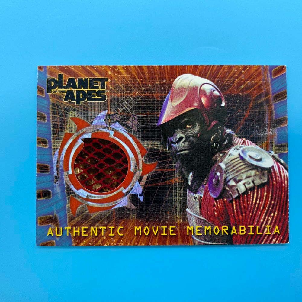 Authentic costume memorabilia card from Planet of the Apes, released by Topps in 2001. This insert features a screen-used fabric swatch from the Gorilla Warrior uniforms seen in Tim Burton’s film adaptation. The card includes a red mesh-textured costume piece and showcases one of the armoured ape soldiers in full costume. Officially licensed by Twentieth Century Fox and part of the official memorabilia insert subset.