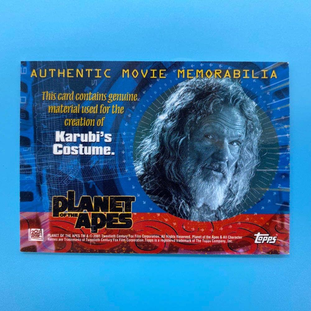 Authentic costume memorabilia card from Planet of the Apes, released by Topps in 2001. This insert card features genuine screen-used material from the costume worn by Karubi, a character from Tim Burton’s reimagining of the sci-fi classic. The card includes a textured brown swatch and is part of the official memorabilia insert subset issued for the film's trading card release.