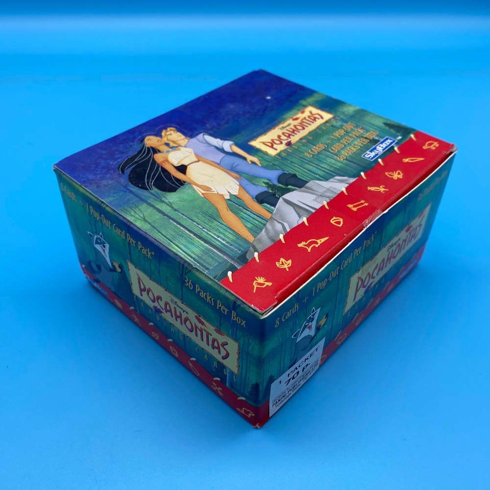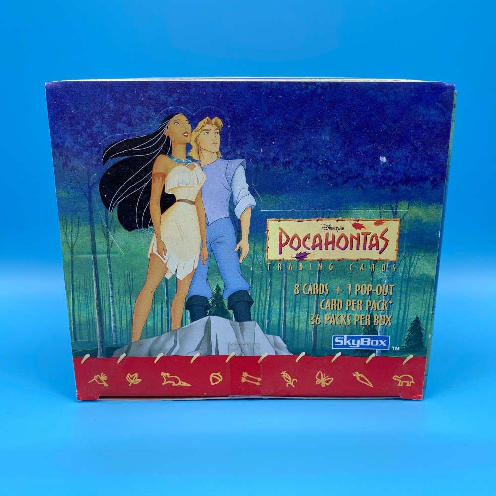 Disney’s Pocahontas trading card box by SkyBox (1996). Includes 36 sealed packs with 8 cards and 1 pop-out card per pack. Look for rare insert cards.