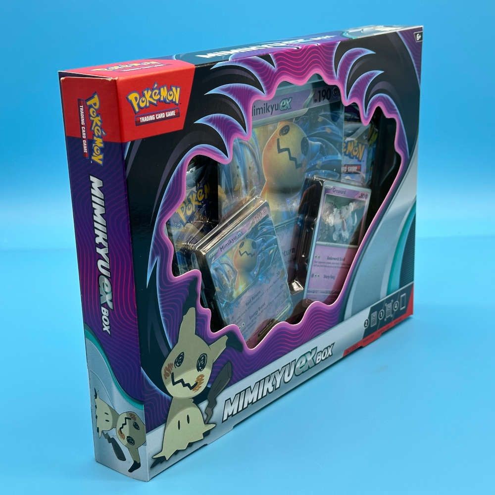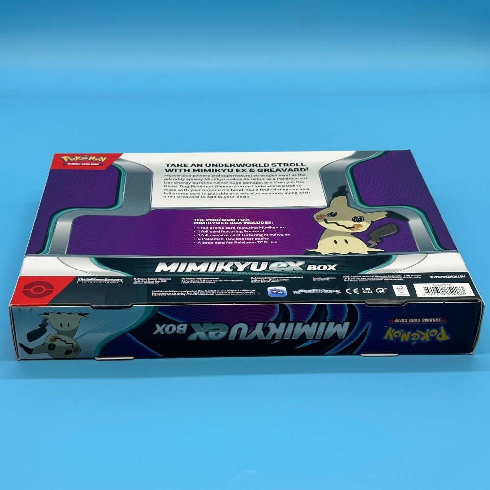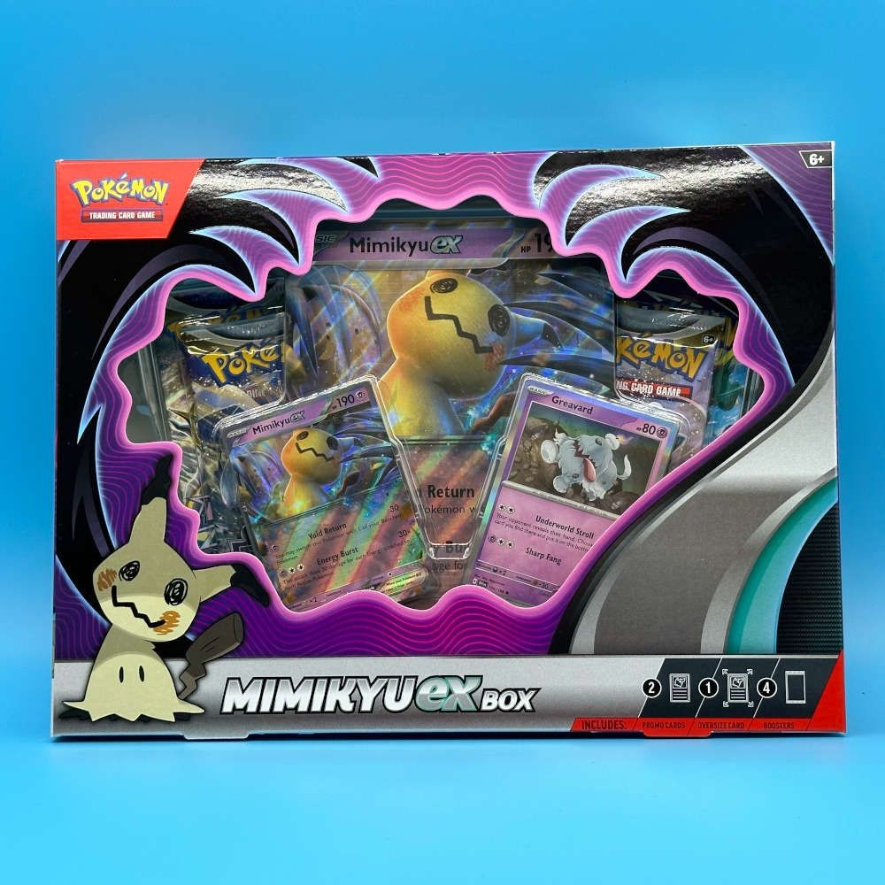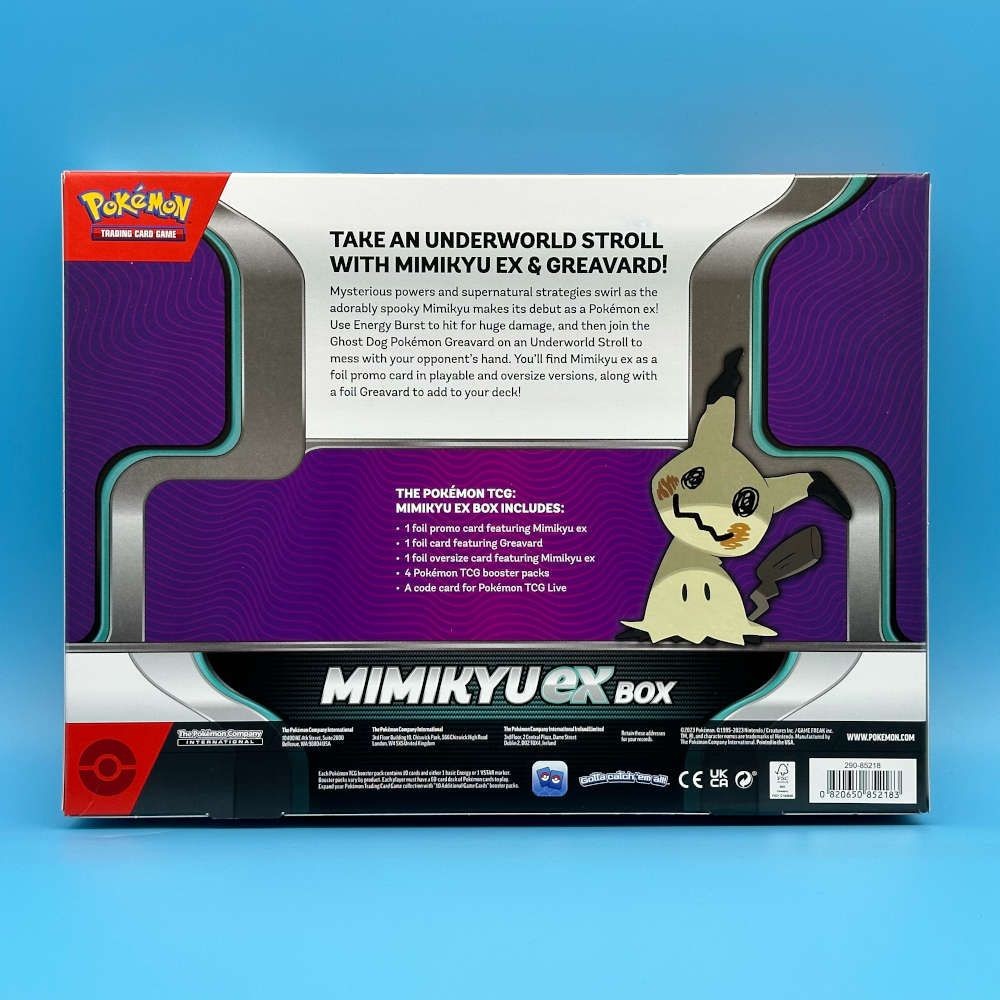 Pokémon Mimikyu ex Box by The Pokémon Company (2023). Includes Mimikyu ex promo, Greavard foil, jumbo card, 4 booster packs, and TCG Live code card.