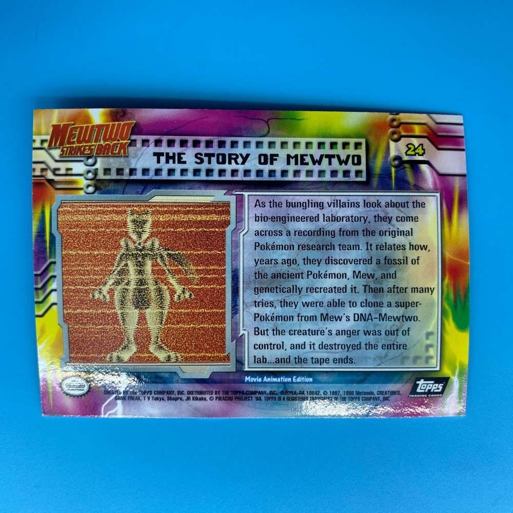 This parallel foil card is number 24 from Pokémon the First Movie trading card series released by Topps. Part of a licensed set based on the 1999 animated film Pokémon: The First Movie – Mewtwo Strikes Back, these foil cards were issued alongside standard base versions, highlighting iconic moments and characters with enhanced reflective foil treatment. Card 24 features parallel artwork and numbering on the reverse.