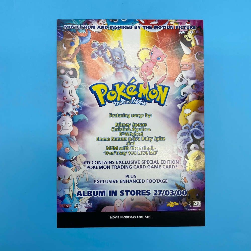 Pokémon The First Movie promo advert sheet from Burger King (2000). Features CD release tie-in. 21 x 15 cm printed sheet with Mewtwo & Pikachu artwork.