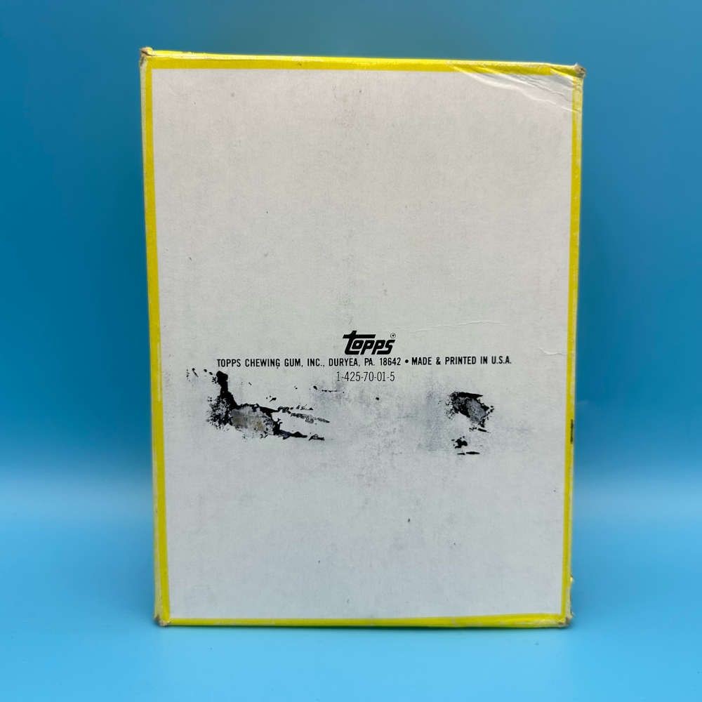 This officially licensed Rambo First Blood Part II trading card box was produced by Topps in 1985. The sealed box contains 36 packets, each with 9 cards, one sticker, and one stick of bubble gum. The packs feature one design on the front, showcasing imagery from the iconic action film. Please note the box shows wear to all edges and has a torn front corner—refer to photos for condition details.