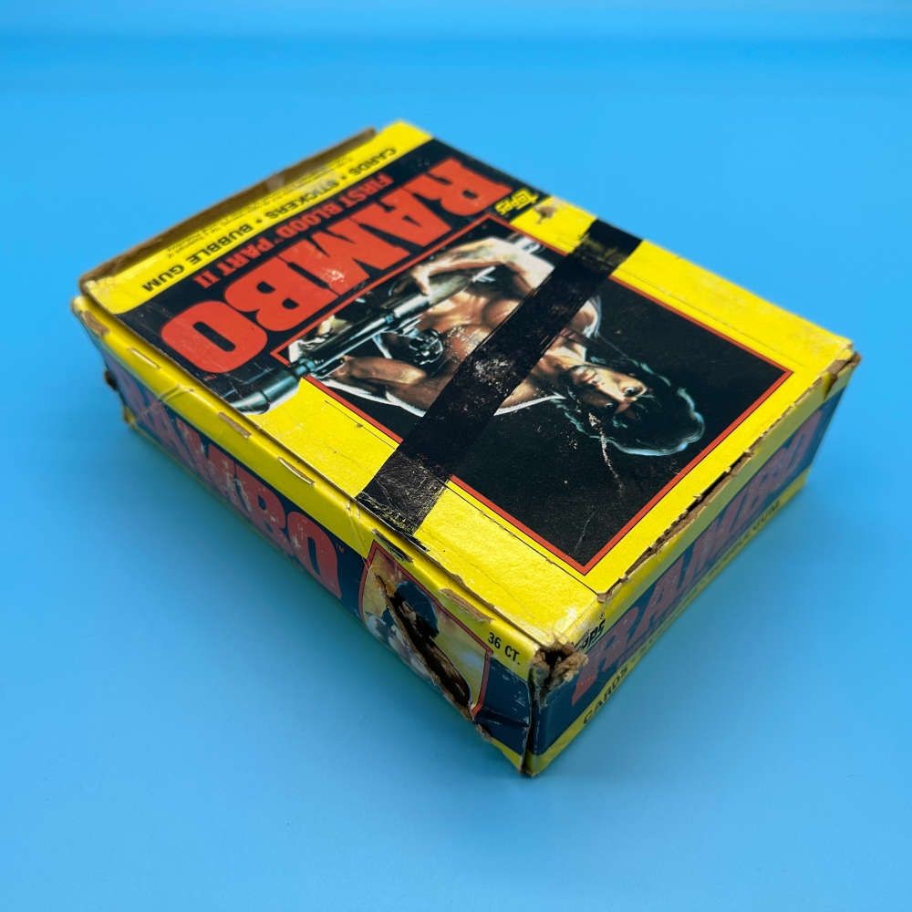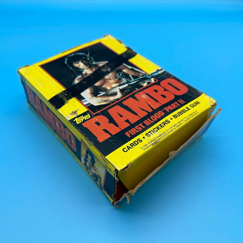 Rambo First Blood Part II trading card box by Topps (1985). Contains 36 packets with 9 cards, 1 sticker, and 1 stick of bubble gum per pack. See damage note.