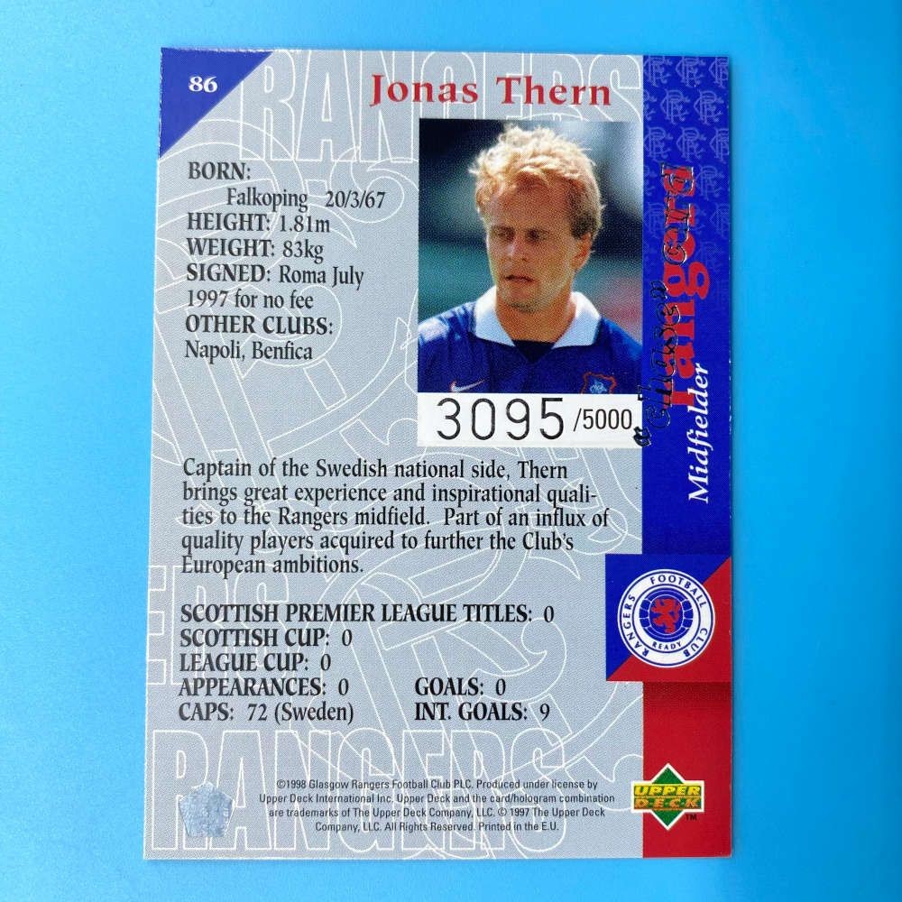 Rangers FC The Gers card of Jonas Thern #86 by Upper Deck (1997). Limited edition card numbered 3095 out of 5000. Part of “The Squad” midfielder subset.