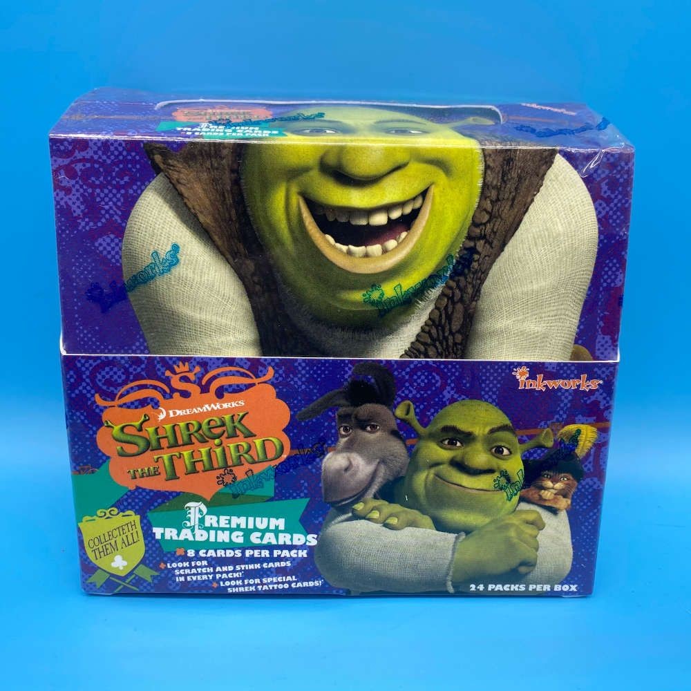 Shrek the Third trading card box by Inkworks (2007). Includes 24 packs with 8 cards each. Look for Scratch and Stink, Tattoo, and Fairytale chase inserts.