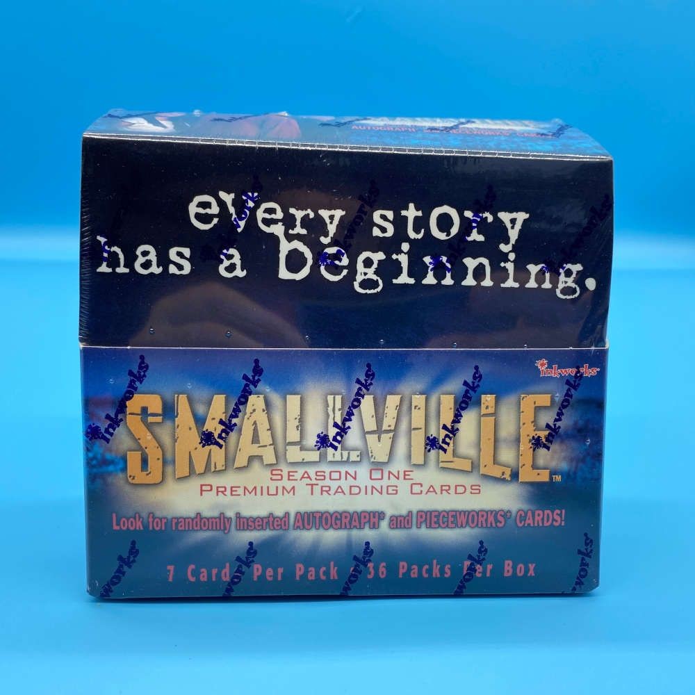 Smallville Season One trading card box by Inkworks (2002). Includes 36 sealed packs with 7 cards each. Look for randomly inserted autograph and Pieceworks cards.