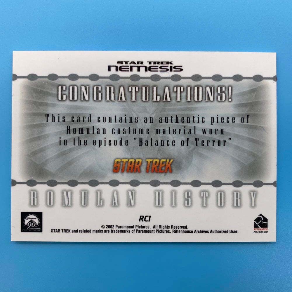 - Product Name: Star Trek Nemesis Costume Card – Romulan History RC1