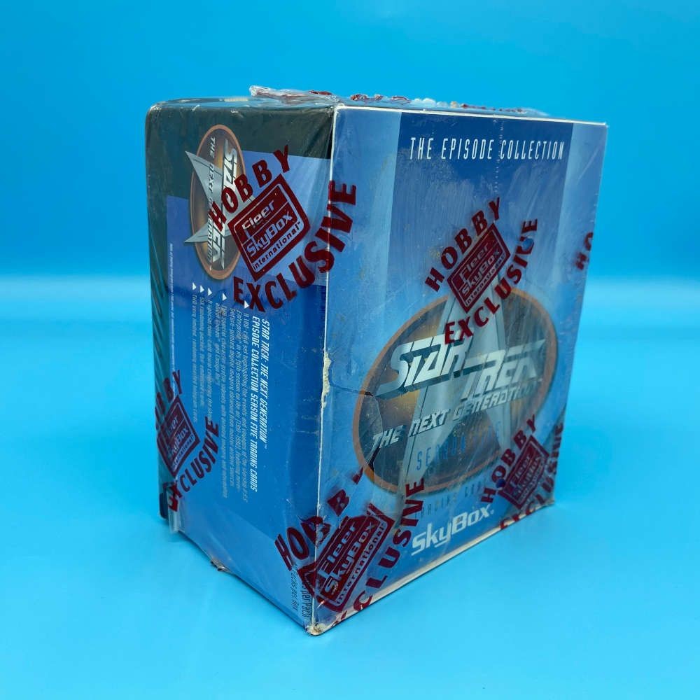 Star Trek: The Next Generation Season 5 trading card box released by SkyBox in 1996. This factory-sealed Hobby Exclusive box includes 48 packets with 8 cards per pack. Part of The Episode Collection series, the set features key moments from the fifth season of the show. Randomly inserted chase cards include foil and hologram cards showcasing pivotal characters and episodes. Officially licensed by Paramount Pictures.
