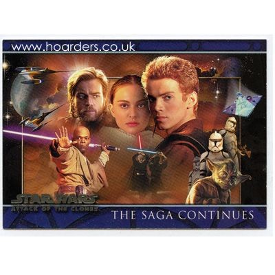 This officially licensed Star Wars: Attack of the Clones promotional trading card (P1) was released by Topps in 2002 to mark the launch of the Episode II card series. The full-colour card features prominent characters including Anakin Skywalker, Padmé Amidala, Obi-Wan Kenobi, and Mace Windu, alongside scenes from the film and clone trooper imagery. The tagline "The Saga Continues" is printed along the bottom border. An excellent addition for Star Wars collectors and promo card enthusiasts.