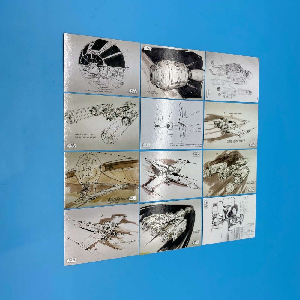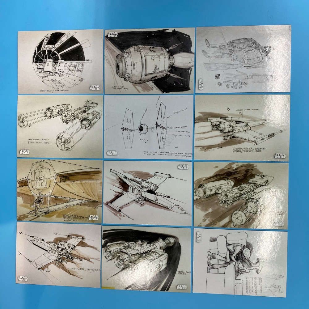 This officially licensed 12-card subset from Star Wars Black & White: A New Hope by Topps includes cards CA-1 through CA-12, all showcasing original concept art used during the production of the 1977 film. The set features early vehicle and spacecraft designs such as TIE Fighters, X-Wings, the Millennium Falcon, and cockpit interiors. Rendered in black and white or muted colour washes, these cards offer a behind-the-scenes look at the creative development of George Lucas’ original vision.