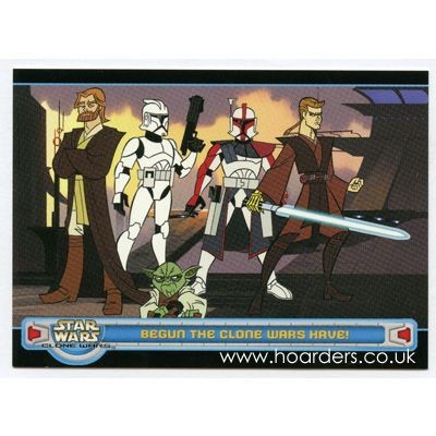 This official Star Wars Clone Wars promotional trading card (P1) was released by Topps in 2004 to preview the animated micro-series developed by Genndy Tartakovsky. The card features stylised character artwork of Yoda, Obi-Wan Kenobi, Anakin Skywalker, and Clone Troopers in battle stance, with the caption “Begun the Clone Wars Have!” This early promo was distributed ahead of the main card set release and remains a sought-after item for collectors of the animated Clone Wars era.