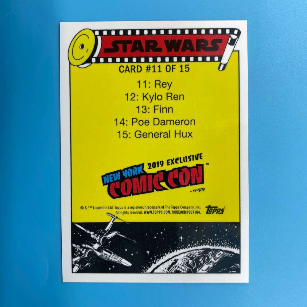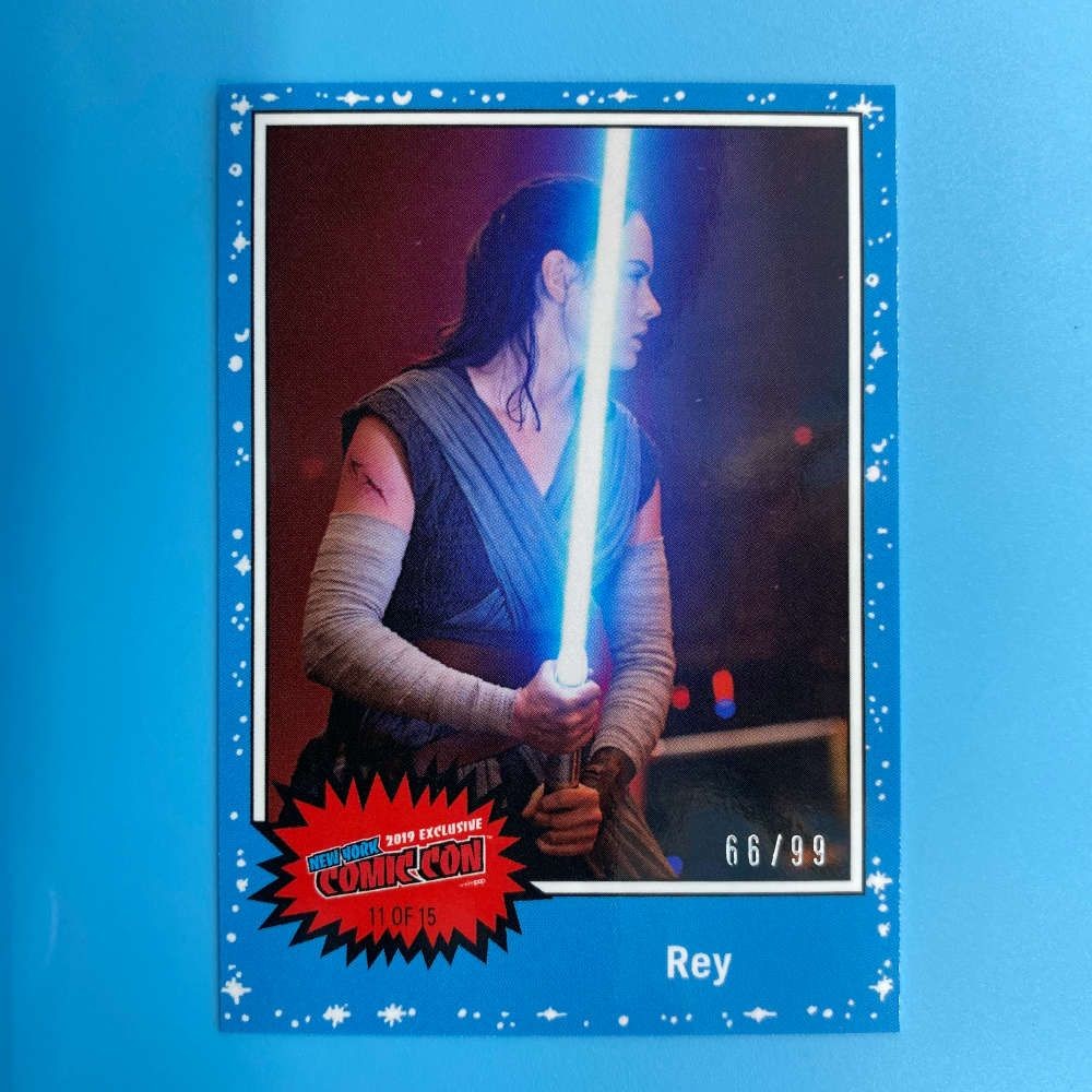 Star Wars Rey card from the 2019 New York Comic Con exclusive Topps set. Numbered 66/99, card #11 of 15 from this limited edition promotional series.