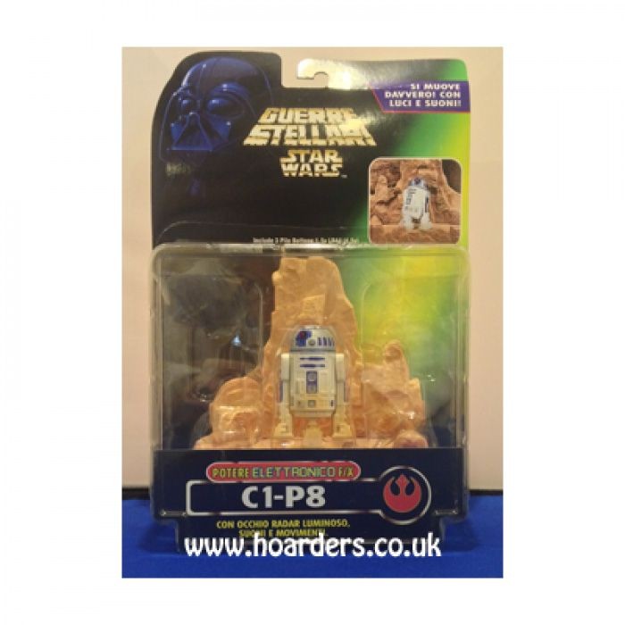 Star Wars Electronic C1-P8 figure by Kenner (1996). Italian packaging with lights, sounds, and Tatooine base. Carded with slight top-right crease.