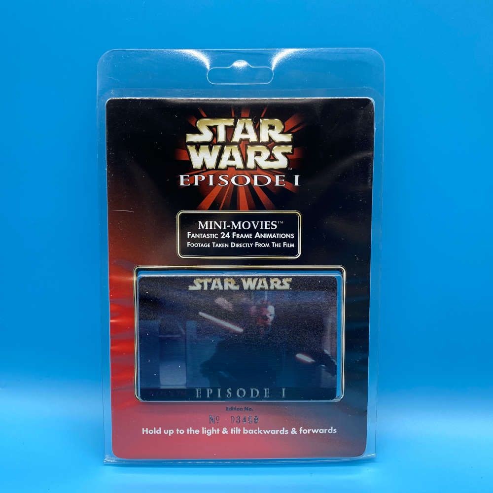 Official set of eight Star Wars: Episode I – The Phantom Menace Mini-Movies featuring 24-frame lenticular animations. Each Mini-Movie captures an animated scene using footage taken directly from the film, creating a cinematic motion effect when tilted. These lenticular cards were released as a licensed Lucasfilm product and are presented in their original blister packaging.