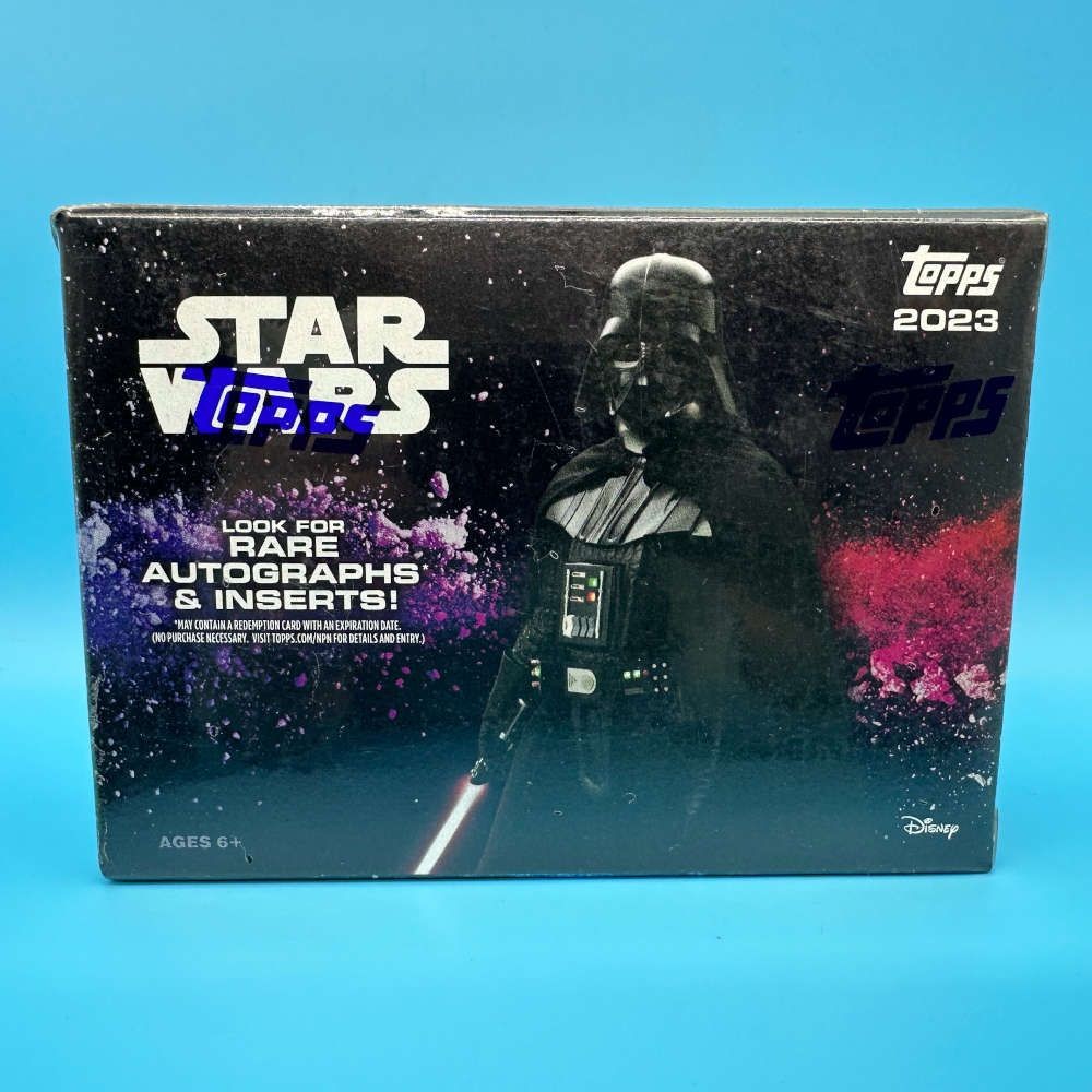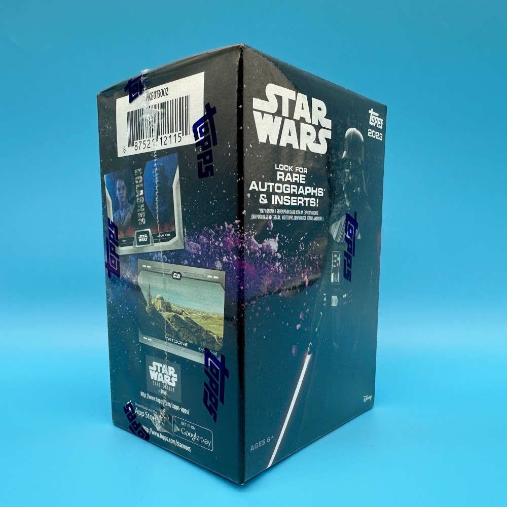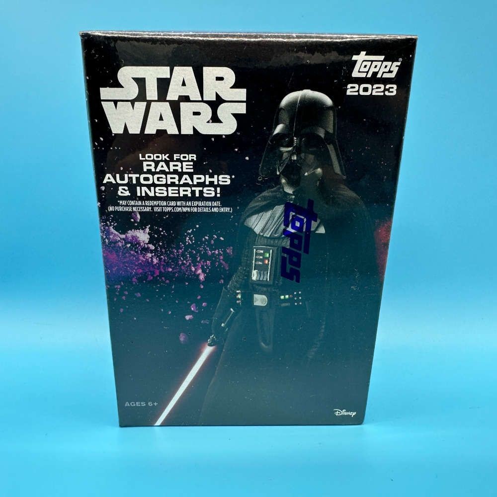 This officially licensed Star Wars Flagship Blaster Box was released by Topps in 2023 and includes 10 packets, each containing 7 trading cards. The box also features 3 exclusive gold foil base card parallels. Insert sets include Rainbow Foil, Comic Covers, Into the Galaxy, Epic Clashes, Lightsaber Stylings, and rare autograph cards. The packaging features Darth Vader artwork and Star Wars/Disney branding. Sealed in original packaging.