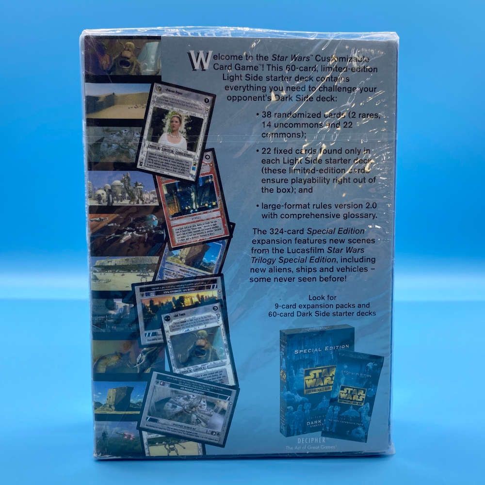 This officially licensed Star Wars Customizable Card Game Light Side Starter Deck was released by Decipher in 1998. The deck includes 60 playing cards designed for the Light Side faction, alongside a rulebook version 2.0 and a glossary for gameplay reference. Featuring characters and scenes from the Star Wars universe, this starter deck is intended for both new players and collectors. It carries the trademarks and copyrights of Lucasfilm.