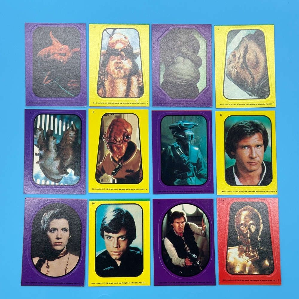 Star Wars Return of the Jedi Series 1 Purple Sticker Set by Topps (1983). Complete 33-sticker variant featuring purple border Yoda. In original packaging.