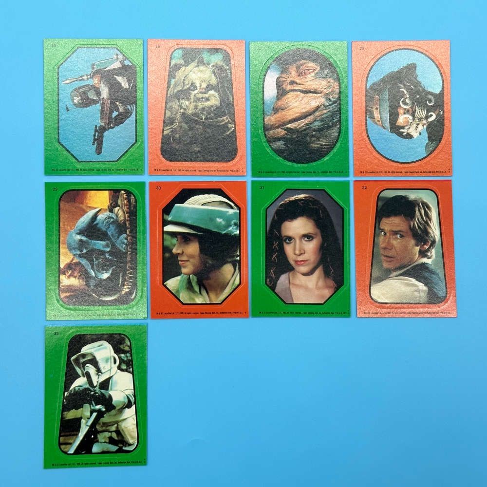 This complete sticker set from Star Wars Return of the Jedi Series 1 was released by Topps in 1983 and includes all 33 stickers from the purple border variation. The set features classic characters such as Luke Skywalker, Leia, Han Solo, Jabba’s palace aliens, and the purple-bordered Yoda sticker. Issued as part of the sticker subset accompanying the 132-card Series 1 release, this colour variant is a distinctive and sought-after vintage collector’s item.