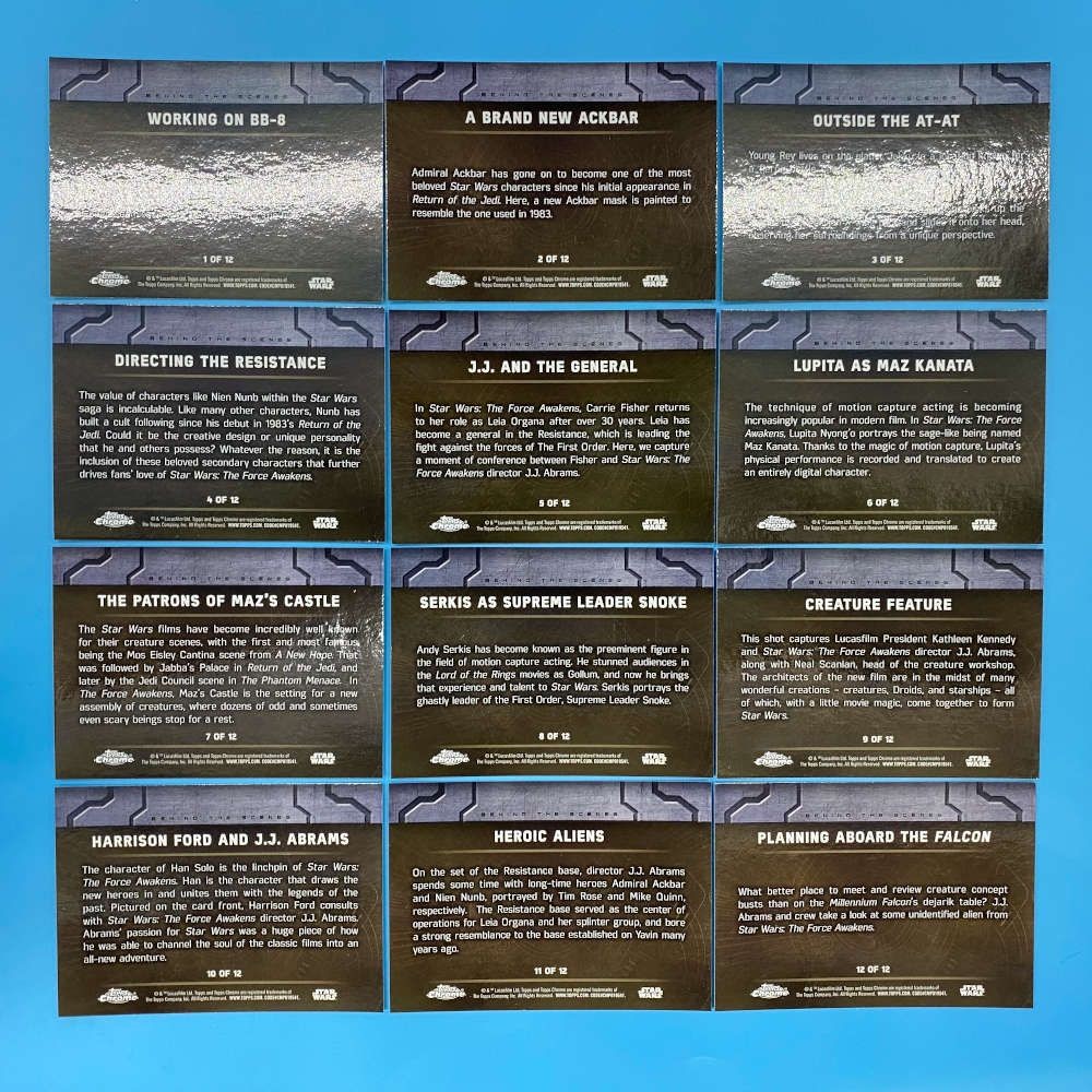 Star Wars The Force Awakens Chrome Behind the Scenes set by Topps. 12-card subset featuring film production moments, cast, and creature design. Full set.