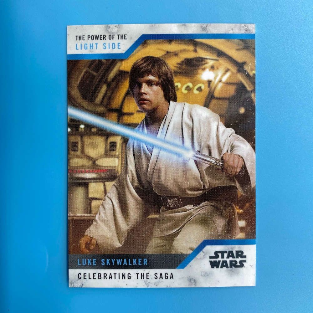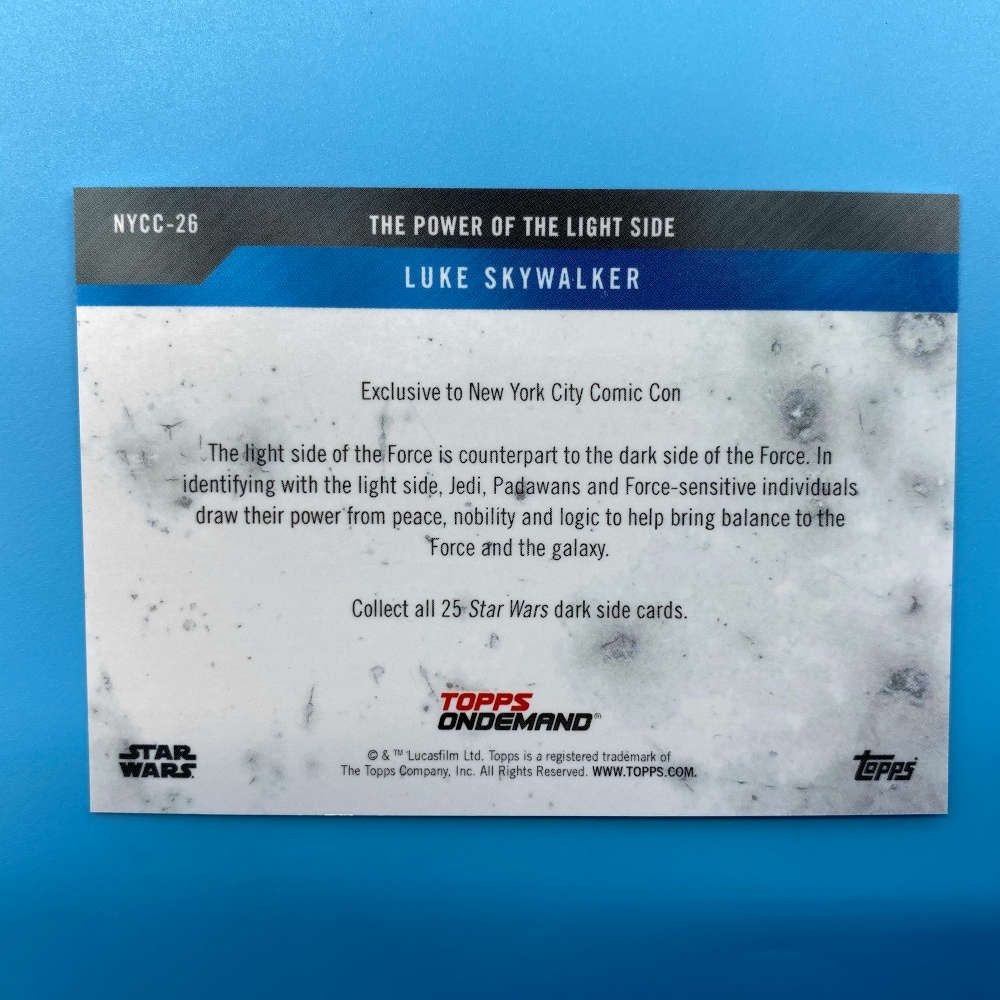 This Star Wars promotional card was released by Topps in 2019 as part of the “Celebrating the Saga” series and handed out exclusively at New York Comic Con (NYCC-26). Titled The Power of the Light Side, the card features Luke Skywalker wielding his lightsaber aboard the Millennium Falcon. It showcases a stylised marble-effect border and blue foil accents.