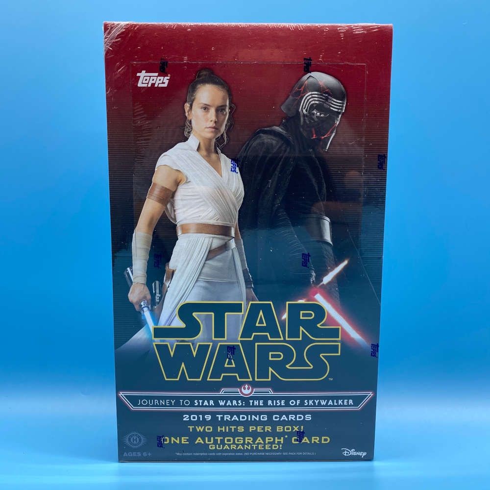 Star Wars Rise of Skywalker Hobby Box by Topps (2019). Includes 24 packs of 8 cards. One guaranteed autograph card. Random inserts throughout.