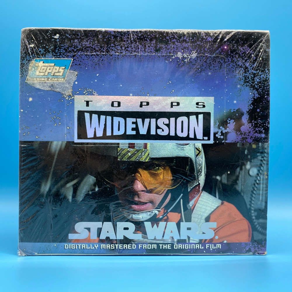 Star Wars Widevision trading card box by Topps released in 1994. Includes 24 packs. Digitally mastered scenes from the original Star Wars film in panoramic format.
