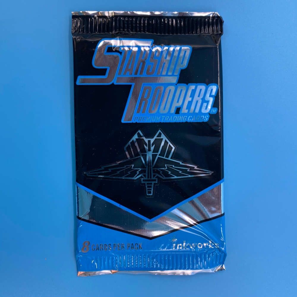 Starship Troopers trading card packet by Inkworks (1997). Includes 8 cards. Look for chase cards: Bug Wars, Starship Gold, and The Art of Starship Troopers.